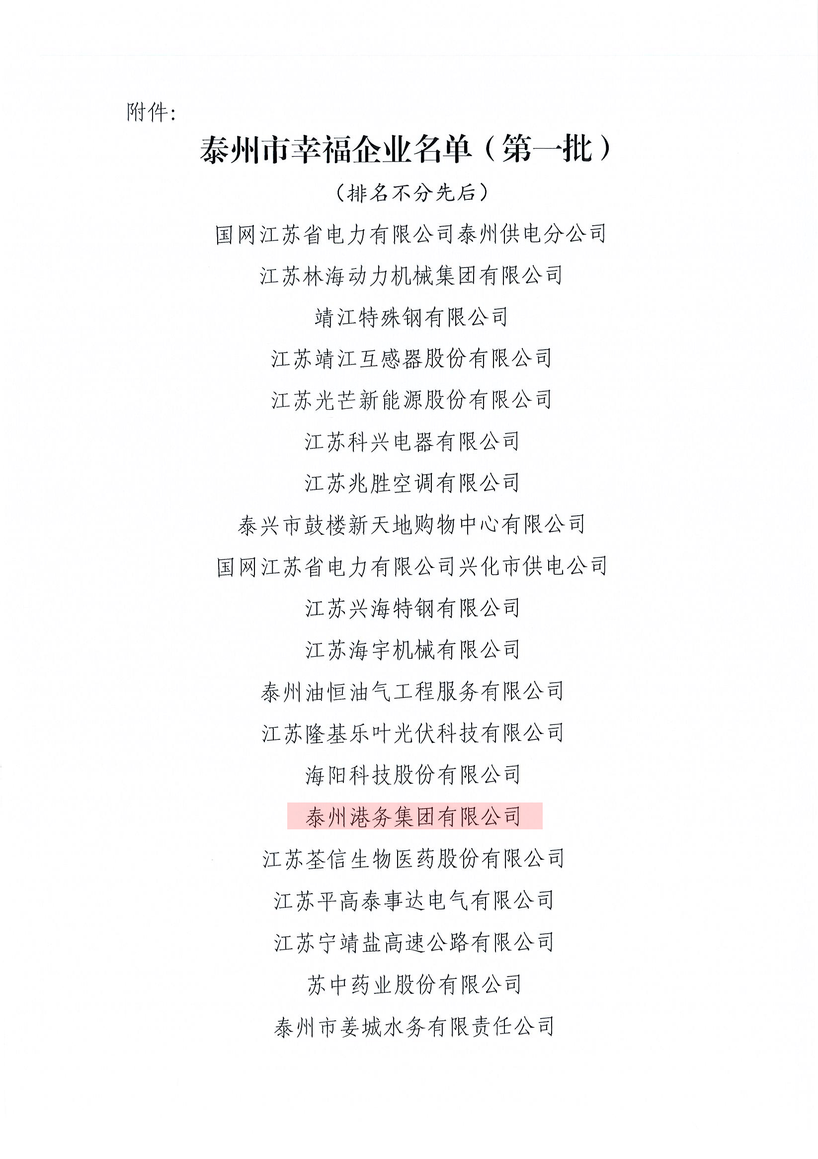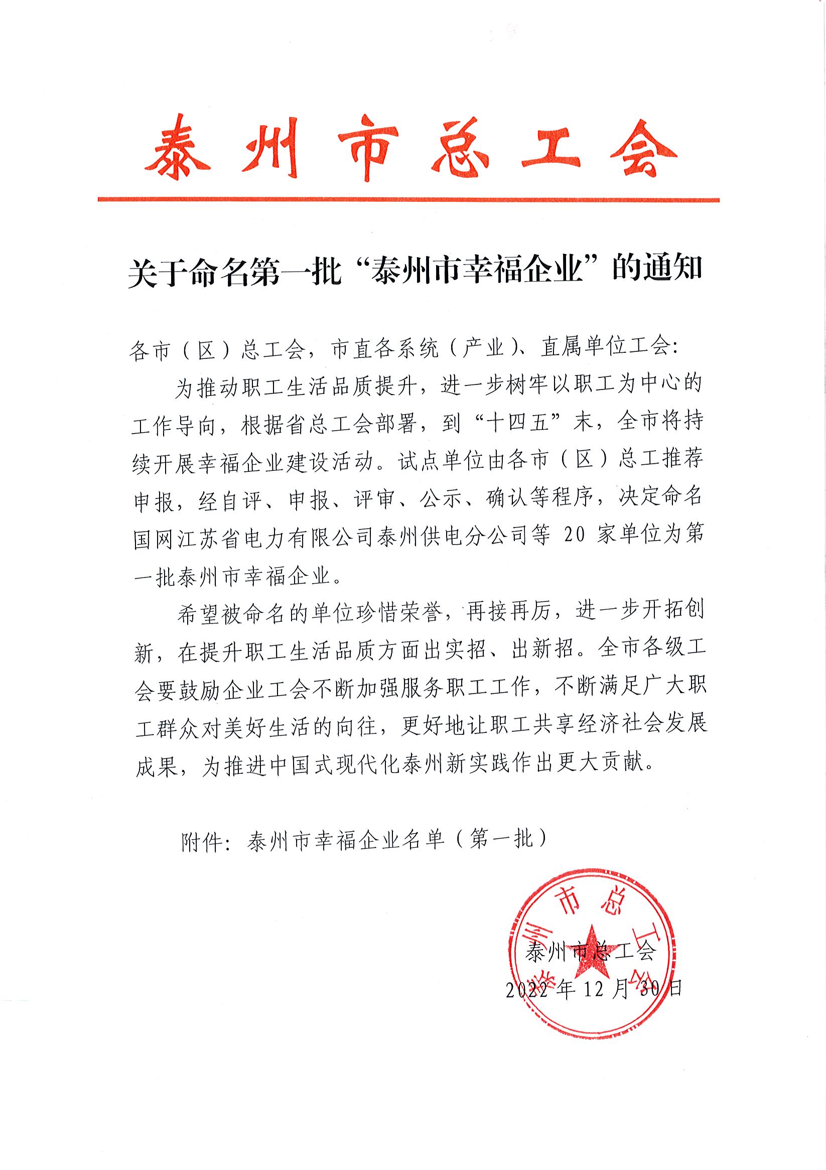 2022年12月31日,泰州市總工會授予泰州港務集團“泰州市幸福企業(yè)”榮譽稱號。